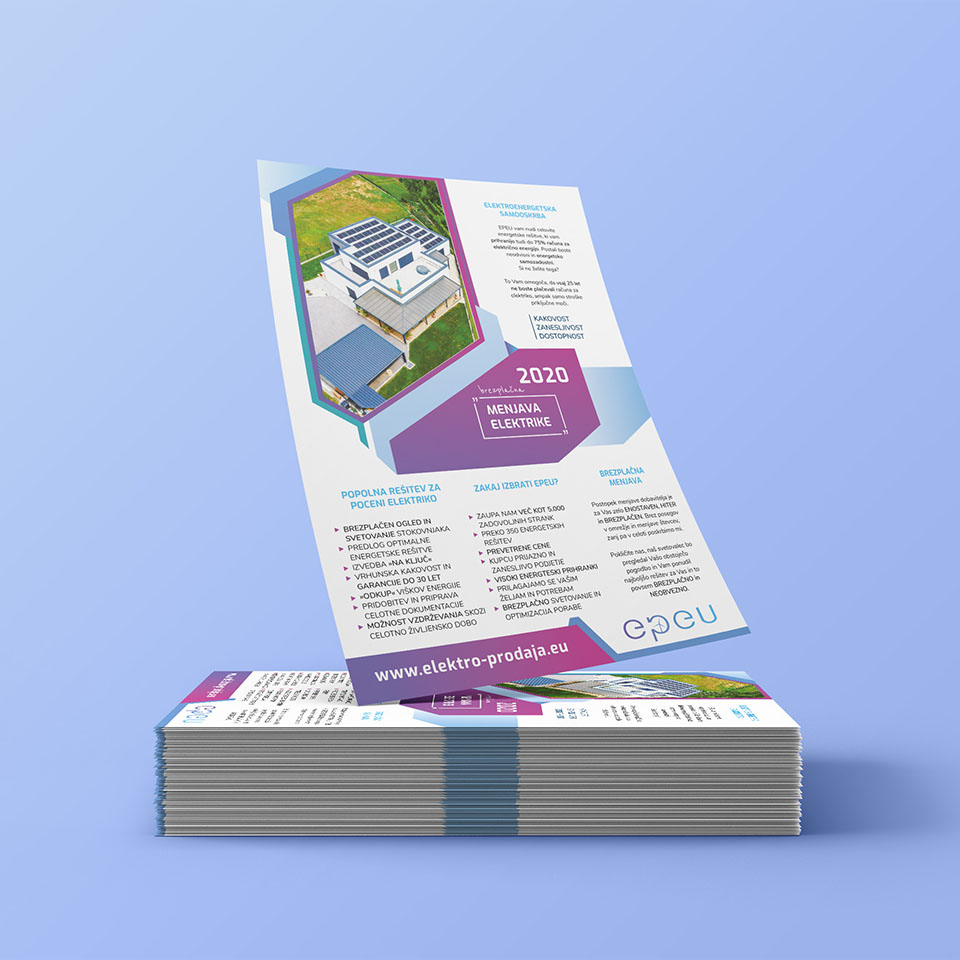 Logotip smo "prenovili". Eleganca, minimalizem in prelivanje barv. Celotno podjetje se z novo podobo idealno poveže, njihove nove pisarne sedaj sijejo v luči nove podobe in jim zelo pristoji. Naša naloga je bila celostna grafična podoba podjetja, izdelava vizitk, reklamnih materialov, kot so letaki, roll upi, zastave in svetlobne table.